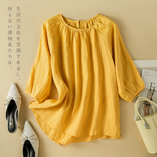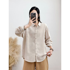复古砂洗麻料内里包边翻领长袖衬衫女文艺大码显瘦休闲上衣