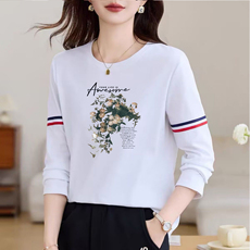 外贸高级感女装春秋季纯棉长袖T恤女打底衫时尚印花洋气拼色上衣