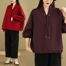 大码新中式V领假两件宽松显瘦针织衫女2025秋装时尚百搭长袖上衣