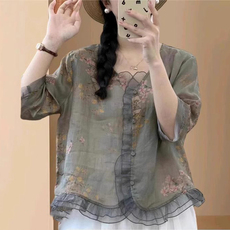 唐装女棉麻七分袖刺绣盘扣文艺复古衬衫女夏季宽松大码纯棉上衣