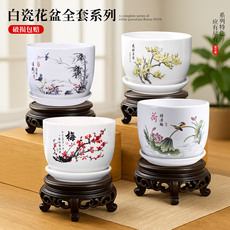 中式白陶瓷桌面花盆栽梅兰竹菊带托盘家用阳台绿萝吊兰绿植物多肉