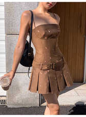 【禧爱】樱花拿铁碎花百褶吊带连衣裙女春装高级感辣妹显瘦短裙