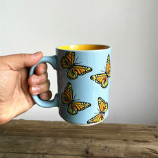 创意内桔色蝴蝶手绘釉下彩牛奶杯早餐复古陶瓷咖啡杯喝水杯大容量