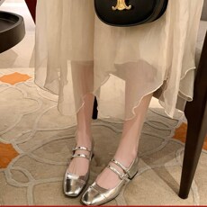 真皮法式气质名媛晚风温柔配裙子水钻银色尖头平底方钻玛丽珍单鞋