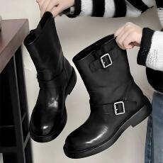 马丁靴女2025秋冬新款平底皮带扣机车靴子真皮英伦风中筒粗跟短靴