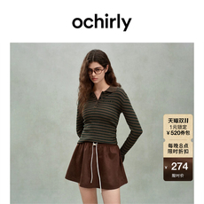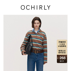 OCHIRLY欧时力 100%棉条纹Polo领t恤女中长宽松复古秋冬新品