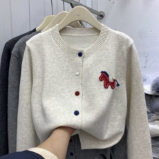 欧洲站小马刺绣灰色针织开衫女秋冬2025新款宽松休闲百搭圆领上衣