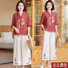 母亲节夏季妈妈装薄款舒适棉麻套装衬衫国风中老年老人两件套衣服