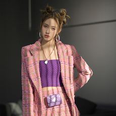 高档蓝紫色格纹亮丝编织小香风羊毛呢面料外套装大衣粗花呢子布料