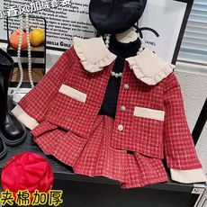 秋冬中大女童小孩小香风加厚夹棉红色格毛呢上衣外套半身短裙套装