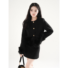 财阀千金小香风毛领重工修身收腰毛呢厚外套短款裙子入冬穿搭套装