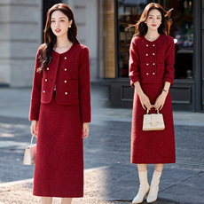 红色小香风套装女秋冬2025新款爆款超火减龄轻奢高级感毛呢套装裙