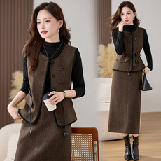 小香风毛呢马甲半身裙三件套女2025秋冬新款气质百搭修身显瘦套装