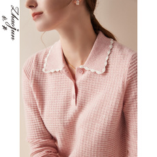 兆君秋冬翻领时尚格纹羊绒衫女百搭套头毛衣内搭打底针织衫