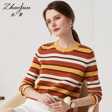 一线成衣100%羊绒金银丝圆领抽条羊绒衫女套头针织打底衫毛衣上衣