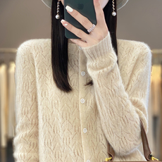 100%纯羊绒衫圆领开衫毛衣士新款百搭宽松时尚羊毛衫镂空打底内搭