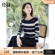 OSA欧莎撞色条纹针织衫毛衣女2025秋装新款通勤风一字领打底上衣