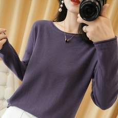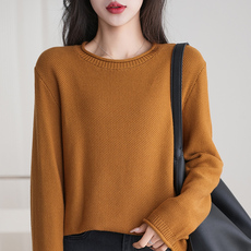 早秋100%纯棉线针织衫女圆领卷边宽松大码打底毛衣全棉落肩上衣