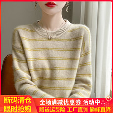 2024秋冬100%纯羊毛衫女圆领条纹拼色针织毛衣宽松羊绒衫打底上衣