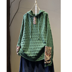 名族风贴布连帽棉线针织毛衣女宽松遮肉秋装休闲百搭套头打底线衣