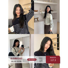 MULVAN撞色圆领条纹针织衫女秋季宽松慵懒打底衫套头长袖休闲毛衣