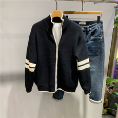 2025秋冬新款立领拼色条纹针织拉链衫外套潮流时尚简约毛衣外套男