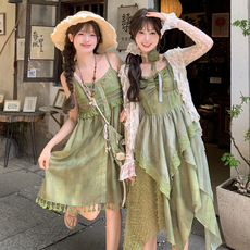 森女部落原创民族风设计感绿色森系吊带连衣裙女2025夏季新款裙子