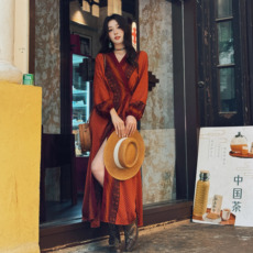 高端蕾丝连衣裙女春秋2025新款民族风高级感仙气复古宽松红色袍子