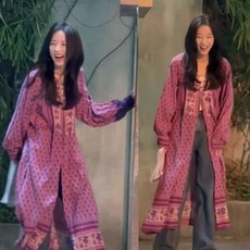 周雨彤同款早秋复古民族风印花连衣裙女宽松显瘦百搭纽扣长袖裙子