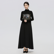 丝绒连衣裙女2025秋新款气质女神范民族风拼接收腰显瘦V领中长裙