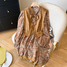 2025春秋新款洋气复古荷叶边小碎花连衣裙麂皮绒马甲旅游民族风