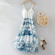 云南手工扎染民族异域风波西米亚连衣裙女夏季V领流苏蕾丝吊带裙