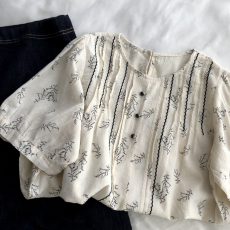 2024夏季双层棉纱短袖衬衫女宽松水墨印花文艺纯棉柔软半袖衬衣