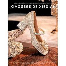 金色粗跟婚鞋女不累脚新娘主婚纱结婚水晶K高跟鞋女法式绝美婚礼