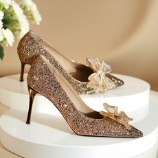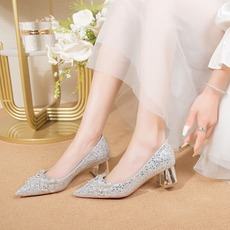 2025秋新款银色亮片尖头高跟细跟性感水晶鞋水钻蝴蝶结女单鞋婚鞋