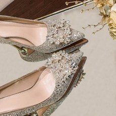 婚鞋2024年新款秀禾婚纱两穿水晶鞋尖头细跟伴娘新娘银色高跟鞋女