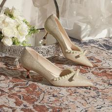 香槟色婚鞋主婚纱鞋不累脚伴娘高跟鞋女尖头低跟粗跟水晶礼服单鞋