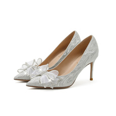 现货速发2024年春款银色婚鞋新娘鞋婚纱水晶鞋蝴蝶结高跟鞋细跟尖