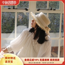 遮阳帽子女春夏季出游防晒太阳帽日系飘带蝴蝶结沙滩手工平顶草帽