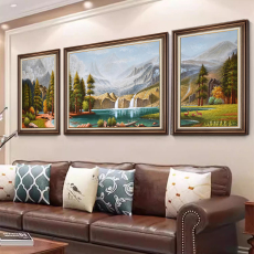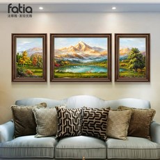 青山绿水山水画客厅挂画沙发背景墙三联画纯手绘油画日照金山壁画