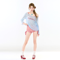 分体泳衣三件套少女学生小个子荷叶边遮胸显瘦复古格子泡温泉泳装