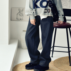 JEANS秋款绿青蛙2628深蓝色笑脸显瘦小直筒裤高腰宽松女牛仔裤