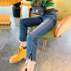 不掉色~春季新款深蓝色侧开叉高腰牛仔裤女显瘦小个子直筒烟管裤