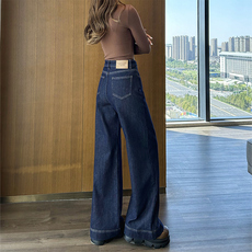 丹宁深蓝色阔腿牛仔裤女春秋季新款高腰显瘦垂感美式宽松直筒裤子