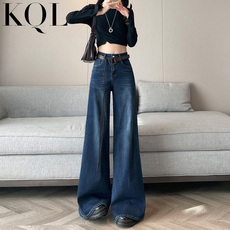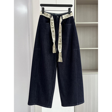 恒木子3326-2新秋款高腰红色腰带深蓝色显瘦不贴腿直筒喇叭牛仔裤