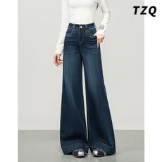 深蓝色阔腿牛仔裤女春秋季高腰宽松显瘦大摆裙裤象腿大裤脚拖地裤