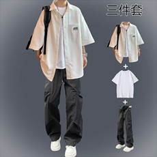 夏季套装情侣短袖T恤立领男装百搭宽松工装衣服一套休闲潮流半袖
