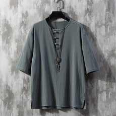 亚麻短袖T恤男中国风唐装夏季纯色半袖中式男装盘扣禅服古装衣服