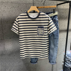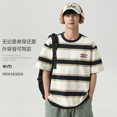 woodsoon 条纹圆领T恤男款短袖夏季宽松潮流休闲情侣半袖上衣男士
