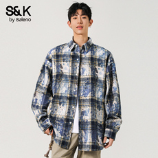 班尼路SK美式复古扎染长袖衬衫男春秋潮牌格子宽松百搭休闲外套MS